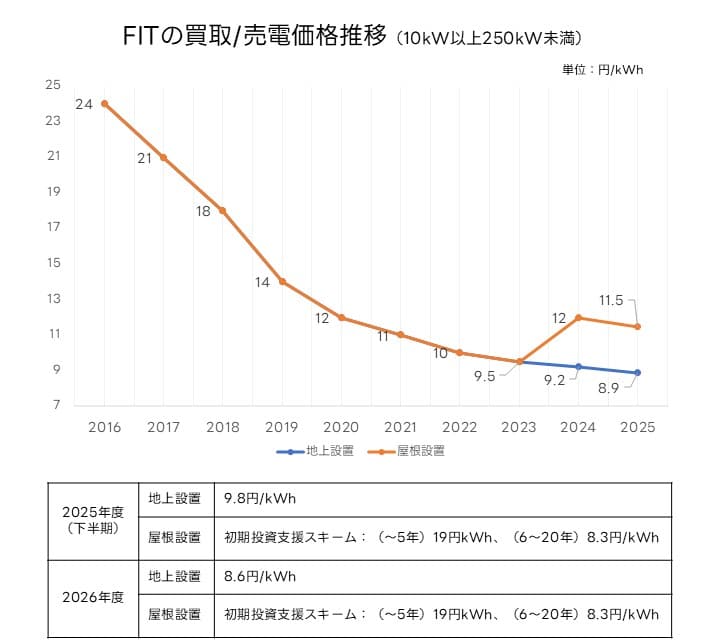 参考:新電力ネット「FIT(固定価格買取制度)の買取/売電価格推移」
