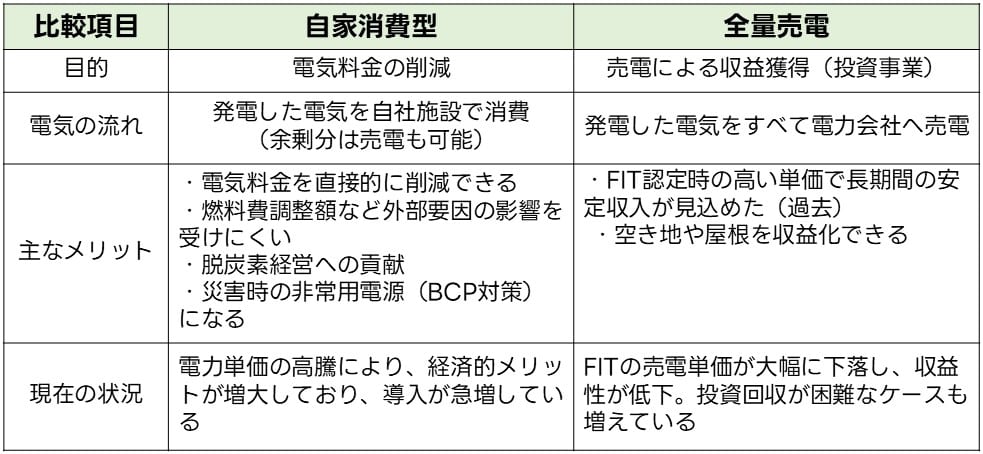 企業が太陽光発電を導入する際には、「自家消費型」と「全量売電型」のどちらを選ぶかが非常に重要なポイントとなります。