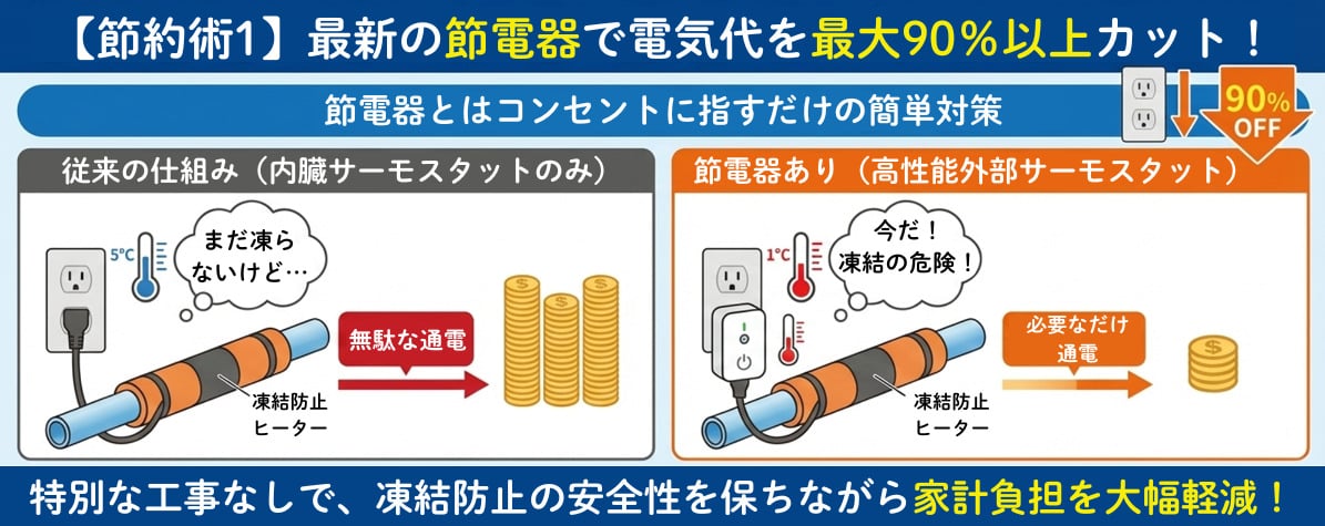 電気代を劇的に減らす最も有効な手段は、コンセントに差し込むだけで使える「節電器」の導入です。特別な工事なしで消費電力を最大90%以上カットでき、凍結防止の安全性を保ったまま家計の負担を大幅に軽減できます。一度の設置で毎年効果が続くため、非常に費用対効果の高い対策です。