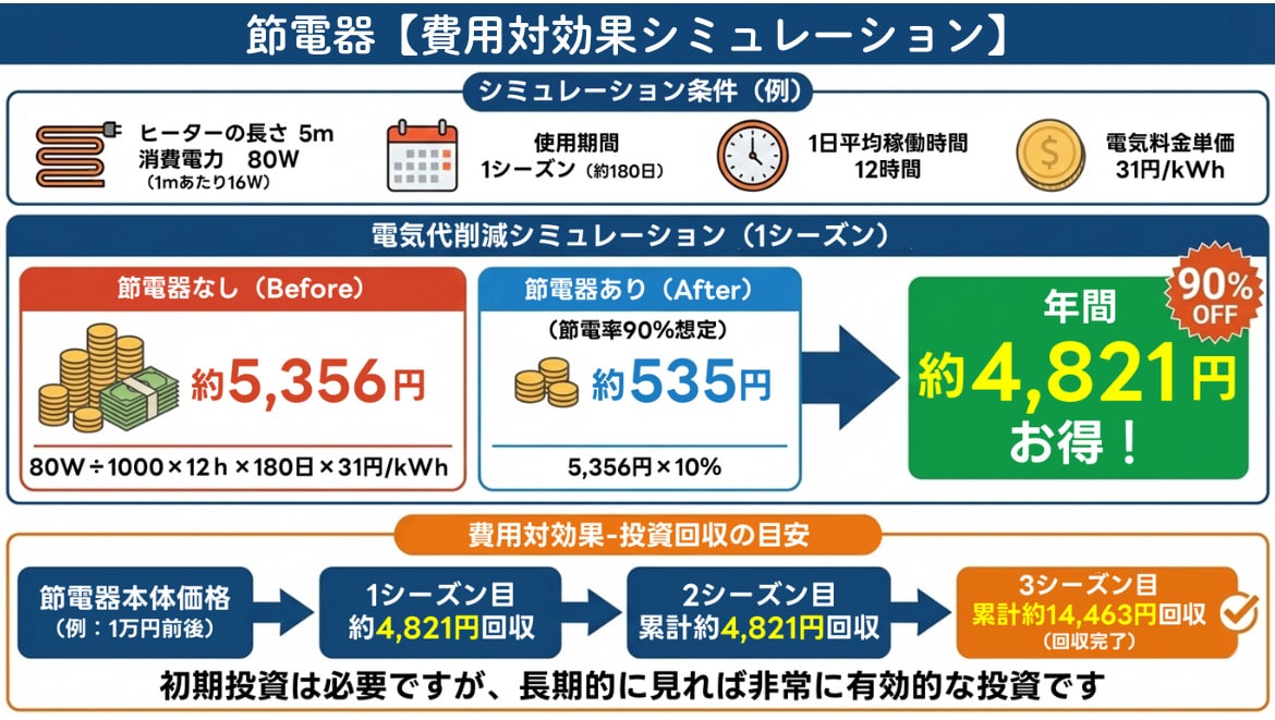 もし、ご自宅に凍結防止ヒーターが複数ある場合や、もっと長時間稼働している場合は、この節約額はさらに大きくなるでしょう。