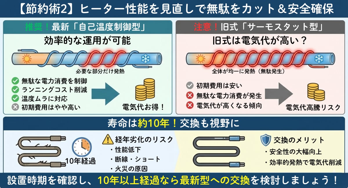 節電器の導入と併せて、現在お使いのヒーター自体の種類や寿命(約10年)を確認することも重要です。古いモデルは効率が悪く電気代を押し上げる原因になるため、最新の「自己温度制御型」への交換が推奨されます。ヒーターの性能を見直すことは、長期的な節約と火災などのリスク回避に直結します。