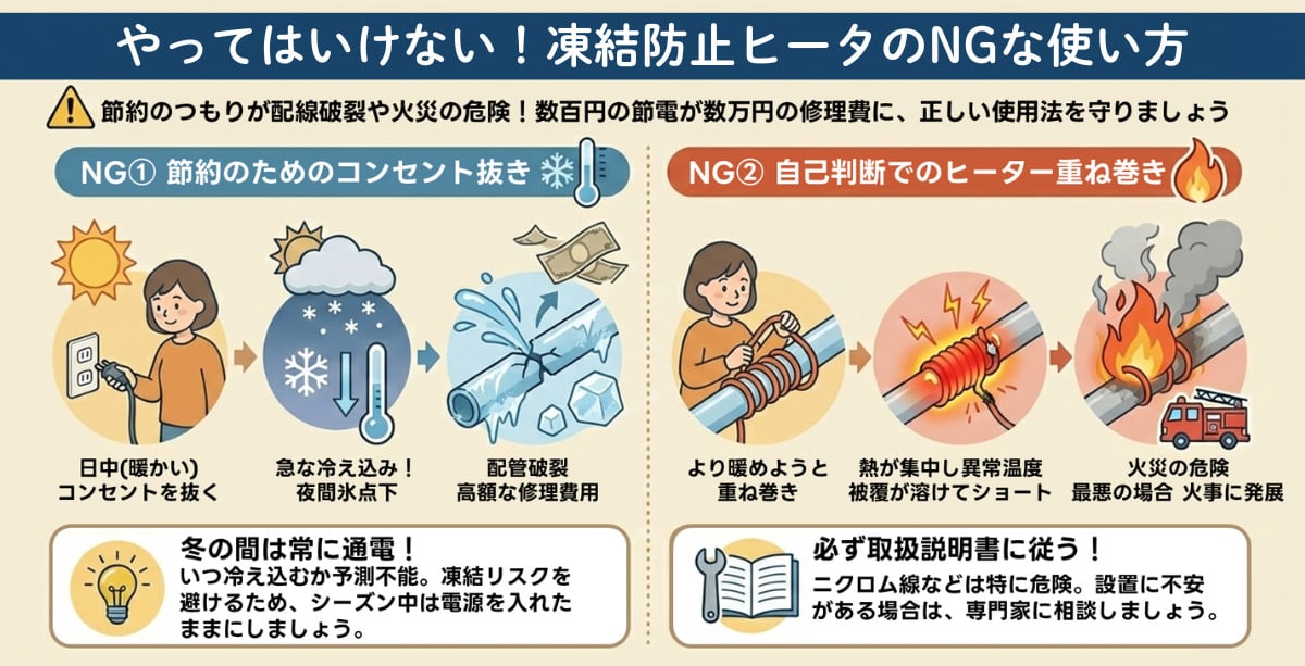 節約のつもりで行った「コンセント抜き」や「ヒーターの重ね巻き」は、配管の破裂や火災を招く非常に危険な行為です。数百円の節電のために数万円の修理費用がかかっては本末転倒なため、正しい使用法を守らなければなりません。安全と節約を両立させるために、絶対に避けるべきNG例を確認しておきましょう。