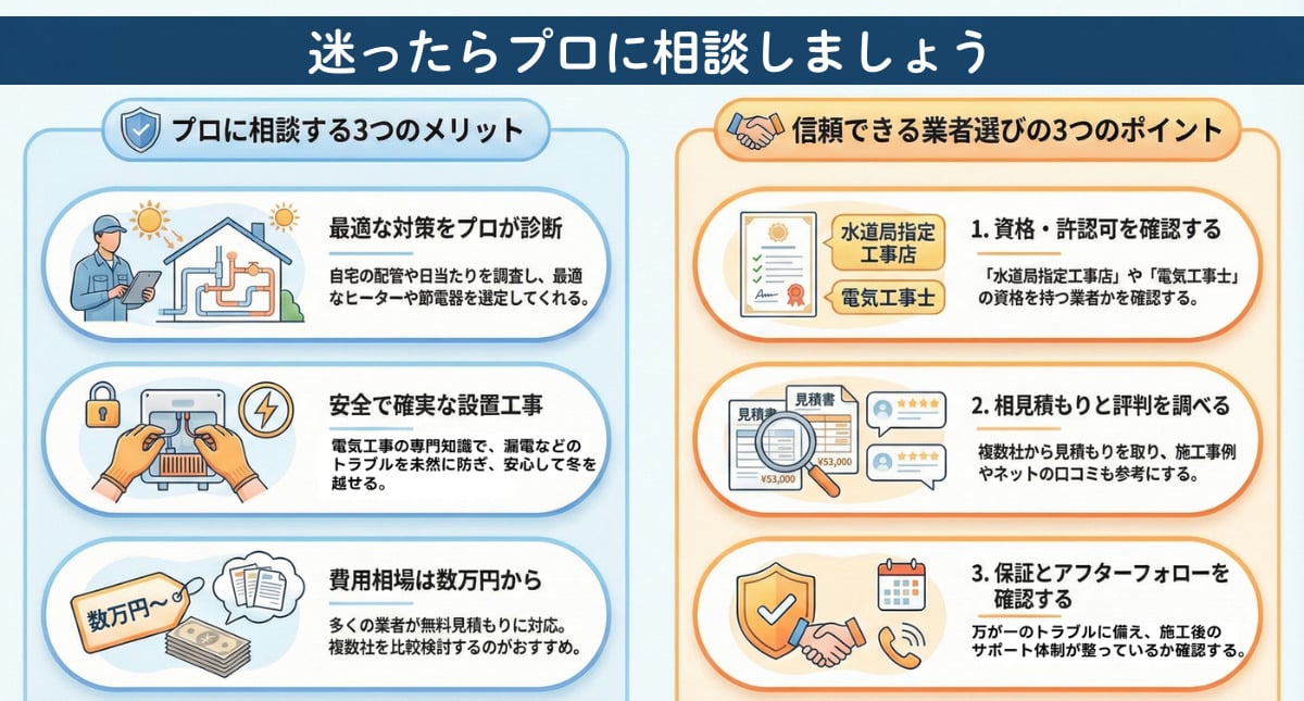 ここまで凍結防止ヒーターの電気代を抑えるポイントをお伝えしてきましたが、「自分の家の配管にはどの対策が一番効くの?」「今のヒーターがいつのものか分からない」と不安に思われる方も多いはずです。