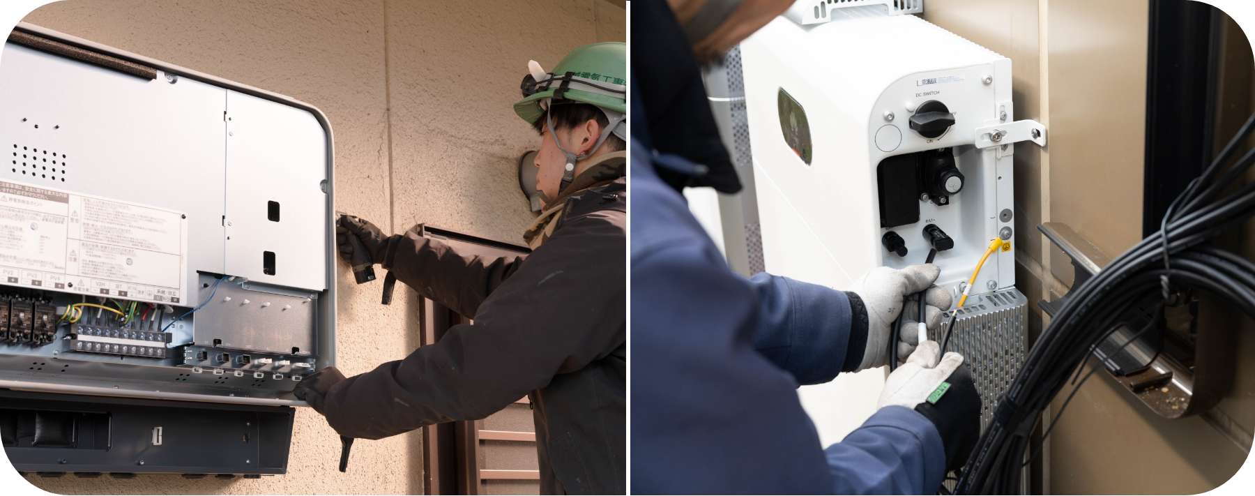 電気工事の資格や技術をお持ちの施工店様には、太陽光発電機器の設置工事や蓄電池の設置工事をお願いしたいと考えています。主な工事の現場としては太陽光発電装置を設置するご家庭や工場の地上部分です。(たまに、工場等などでは屋根上に設置することもあります。)太陽光発電パネル(モジュール)で集めたエネルギーを電気に変換するためのパワコンや、蓄電池の設置をお願いいたします。